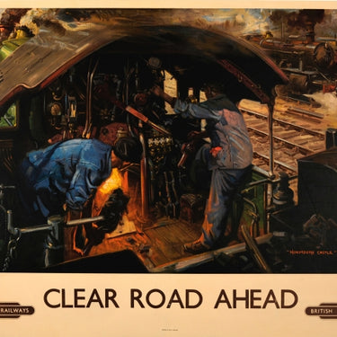Original vintage travel advertising poster published by British Railways - Clear Road Ahead - featuring a fantastic image by the notable British artist Terence Tenison Cuneo (1907-1996) entitled Monmouth Castle showing the interior of steam locomotive No 5037 with the operator loading coal into the fire boiler and the driver standing in front of the controls and looking ahead out of the window with all the instruments and pipes seen in detail and other steam trains on the railway tracks nearby, the text below in stylised letters with the British Railways logo. Published by the Railway Executive. Printed by Waterlow & Sons Ltd, London & Dunstable. Large size. Horizontal. Fair condition, restored folds, tears and loss, restored staining on borders, backed on linen.