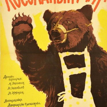 Original vintage Soviet movie poster for a comedy circus film Clubfooted Friend Косолапый Друг directed by Vladimir Sukhobokov and written by Nikolay Erdman and Mikhail Volpin, starring Nikolay Bogolyubov as the tamer and teacher with Yuri Dedovich as the young animal trainer and Lyudmila Chernyshyova, Tatyana Konyukhova, Ekaterina Savinova, Oleg Popov and Konstantin Sorokin, featuring a colourful image of a bear waving against the yellow background, wearing a muzzle and an apron with the title text in stylised lettering above and credits on the side below. Good condition, folds, creasing, tears on image, small paper loss on image.