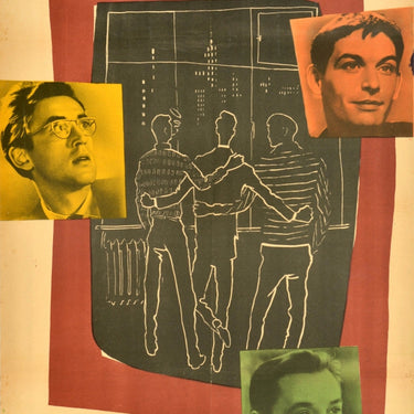 Original vintage Soviet film poster for a drama film - Коллеги / Colleagues - directed by Aleksey Sakharov and starring Vasiliy Livanov, Vasiliy Lanovoy and Oleg Anofriev, featuring a black and white illustration of three medical graduates standing with their arms around each other in front of a window, three colourful inserts of the actors on the sides, the stylised handwriting style text and credits above and bold title below. Good condition, folds, creasing, tears, pinholes, paper loss in bottom right corner, staining.