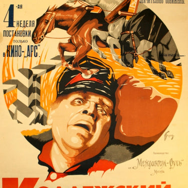 Original vintage cinema poster for the film, Collegiate Registrar (Коллежский регистратор / The Stationmaster) directed by Ivan Moskvin and Yuri Zhelyabuzhsky and starring Vsevolod Aksyonov, Nikolai Aleksandrov and Nikolai Kostromskoy. Dynamic artwork by I. Bograd featuring troika horses galloping at the top with a man in uniform below. Good condition, backed on linen.