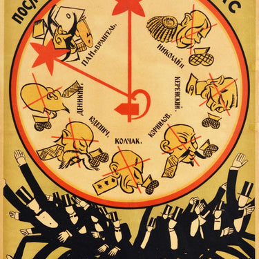 Original antique Communist propaganda poster - Последние час / Final Hour - featuring a clock with caricatures on its face crossed out in red including the last emperor of Russia Tsar Nicholas II (Nikolai II Alexandrovich Romanov; 1868-1918), the Russian lawyer and revolutionary Alexander Kerensky (1881-1970), the explorer and Russian military intelligence officer and general of the Imperial Russian Army Lavr Kornilov (1870-1918), the Imperial Russian Navy admiral and polar explorer Alexander Kolchak (1874-1920), the WWI commander of the Russian Imperial Army and leader of the anti-communist White Army during the Civil War Nikolai Yudenich (1862-1933), and the Lieutenant General of the Imperial Russian Army and Deputy Supreme Ruler of Russia during the Russian Civil War Anton Denikin (1872-1947), with the officer in the Imperial Russian Army, commanding General of the anti-Bolshevik White Army and prominent exiled White emigre Pyotr Wrangel (1878-1928) and Pan (for the Polish Army) as the final hour between two red Soviet stars as the hands and the USSR hammer and sickle emblem in the centre, the title text in bold lettering around the top and men in top hats and black tie / tuxedo suits running away below the clock face. Russian Soviet Federative Socialist Republic RSFSR. Good condition, restored paper losses, restored folds, restored tears, staining, backed on linen.