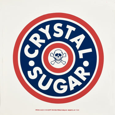 Original vintage poster issued by Pandora Productions as a sugar protest featuring artwork in the style of the American Crystal Sugar Company logo depicting the bold white text against a blue background inside red circles with a skull and crossbones in the centre of the target. Design by Bart deMalignon. Crystal Sugar was formed in 1899 as an agricultural cooperative, based in Minnesota USA. Very good condition, small tears, minor creasing, small ink mark from original printing.