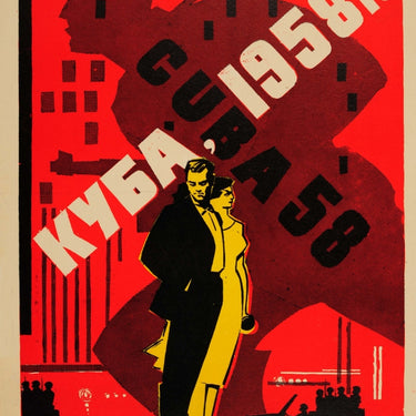Original vintage movie poster for the Soviet release of a Cuban film about Fidel Castro's revolution against the authoritarian government led by President Fulgencio Batista - Cuba 1958 - directed by Jorge Fraga and Jose Miguel Garcia Ascot. Bold design featuring a man and lady in black and yellow in front of a red background with the shadow of a man holding a gun in front of buildings above silhouettes of soldiers in military vehicles driving with their headlights on, the stylised title text in English and Russian lettering forming a X in the centre. Good condition, restored paper loss in margin, backed on linen.
