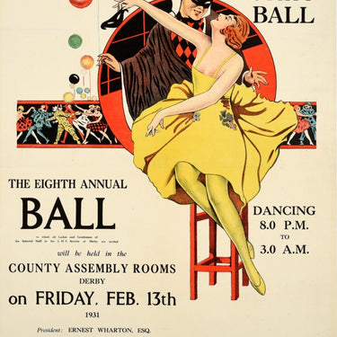 Original vintage LMS poster for the London Midland and Scottish Railway Derby Staff Ball - The Eighth Annual Derby Staff Ball (to which all Ladies and Gentlemen of the Salaried Staff in the LMS Service are invited) will be held in the County Assembly Rooms Derby on Friday, February 13th 1931 President: Ernest Wharton Esq. Dancing 8pm to 3am - featuring colourful artwork depicting a smiling man in a black masquerade mask and cape behind a lady wearing a yellow dress decorated with flowers and holding her mask in her hand, sitting on a red chair, with balloons next to a red and black circle and a row of smaller illustrations of happy party goers dancing in fancy dress and clown costumes in the background, the bold stylised lettering above and below with ticket information. Good condition, restored paper losses, restored tears, staining, backed on linen.