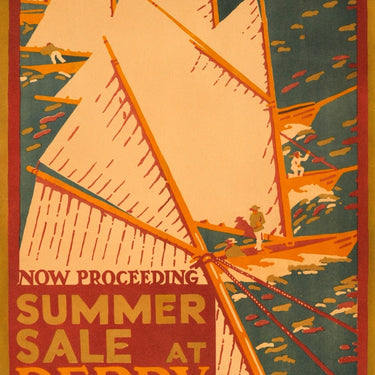 Rare original vintage advertising poster for the London department store Derry & Toms in Kensington: Now proceeding Summer sale at Derry & Toms Kensington W8. Stylish and colourful early design by one of the most renowned poster artists of the 20th century Edward McKnight Kauffer (1890-1954), featuring sailing boats racing in a regatta with the text box below, communicating a fresh summer feeling through a mix of Japanese woodcut, expressionist, and Fauvist influences. Derry and Toms (1860-1973) was founded by Joseph Toms and his brother in law Charles Derry and the company opened their new Art Deco style department store building in 1933, which is now a Grade II Listed Building and still home to the Kensington Roof Gardens on the 7th floor. Good condition, restored loss and tape marks, backed on linen.