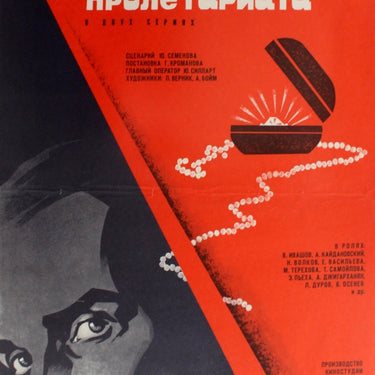 Original vintage Soviet film poster, Diamonds for the Dictatorship of the Proletariat (Бриллианты для диктатуры пролетариата / Brillianty dlya diktatury proletariata), a spy thriller set in 1921 written by Yulian Semyonov and directed by Grigori Kromanov. Dramatic image featuring a bayonet sword with the title, credits and jewellery (a diamond in a box and a pearl necklace) on one side against a red background, and a man peering around from the other side. Very good condition, folded as issued, small tears.