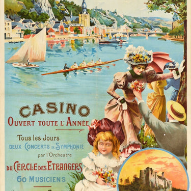 Original antique Chemin de Fer du Nord et Nord Belge / North Belgium railway travel poster for Dinant sur Meuse Belgique - featuring a scenic view towards a town and bridge reflected on the water with a rowing boat passing a sailing boat on the river and people in the foreground under a tree by the riverside, a man giving flowers to a lady with two more ladies under an umbrella and a smiling young girl holding a small bunch of flowers, sitting on the grass and looking at the viewer, the title text above by the hills in the distance and a smaller image of an historic building with the information text below - Casino ouvert toute l'annee Tous les jours deux concerts et symphonie par l'orchestre du Cercle des Etrangers 60 musiciens Villegiature des famille nombreuses attractions / Casino open all year Every day two concerts and symphonies by the orchestra of the Circle of Strangers 60 musicians Family resort many attractions. Good condition, folds, staining, backed on linen.