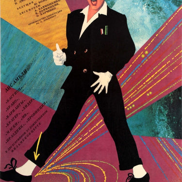 Original vintage Soviet film poster for a romantic musical from the Perestroika era about a young DJ trying to find the young lady who left her bag at his first gig - диск жокей (Diskzhokey / Disk Jockey) - directed by Boris Nebieridze, written by Sergei Ivanov and starring Aleksandra Shvetsova, Aleksey Vesyolkin and Natalya Polishchuk, featuring popular Soviet bands of the time, including Bravo led by Zhanna Aguzarova. Colourful 1980s disco dancing style image of a lady with white hair wearing a black suit with a white shirt, white gloves, black shoes and white socks, singing and making a thumbs up gesture with an arrow pointing to her left foot against rays of lights and colours in the background, the title text below in stylised yellow luminous letters with the credit text on the side. Very good condition, folded as issued.