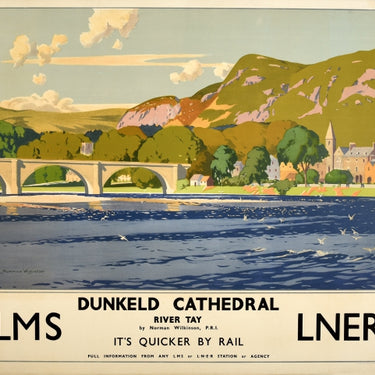 Original vintage travel poster issued by the London, Midland and Scottish Railway LMS and London North Eastern Railway LNER - Dunkeld Cathedral River Tay It's quicker by rail - featuring artwork by the notable British artist and illustrator Norman Wilkinson (1878-1971) depicting birds flying over the waves on the River Tay near the stone bridge reflected on the water with the historic Dunkeld Cathedral (built 1260-1501) visible between the trees in front of the green grass covered hills in the background, the text in bold black lettering on the margin below. Dunkeld Bridge (opened 1809) was built by the Scottish engineer Thomas Telford (1757-1834). Printed in Great Britain by Staffords Netherfield. Horizontal. Large size. Good condition, small restored tears, restored folds, staining, backed on linen.