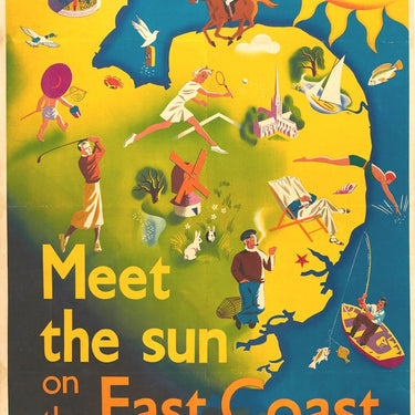 Original vintage LNER travel poster issued by the London and North Eastern Railway - Meet the Sun on the East Coast It's Quicker by Rail England's Drier Side - featuring a colourful summer holiday design showing a smiling sun shining down over a map of the East Coast with people enjoying various sports and activities including horse riding, swimming, sailing, tennis, golf and fishing with birds flying overhead, a rabbit poking its head from a hole to another rabbit, a child approaching a crab and a lobster fisherman smoking a pipe, and a bandstand, cathedral and windmill depicted with trees, rivers and lakes, the bold text below. The East Coast of England boasts popular seaside resorts and picturesque countryside and includes the counties of Essex, Lincolnshire, Suffolk and Norfolk. Printed by Jordison & Co. Ltd. Good condition, restored folds, creases, staining, backed on linen.