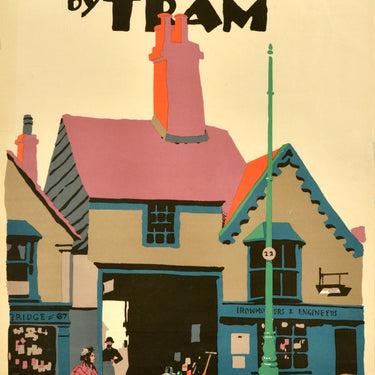 Original vintage travel poster - Edgware by Tram - featuring a colourful image by the notable British poster artist Frank Newbould (1887-1951) depicting a lady wearing a shawl and carrying a basket in front of shop buildings, one number 67 and another an Ironmongers & Engineers with a man in an apron working by a lawnmower and watering cans in an alley between them, a post numbered 22 on the pavement and the bold stylised title text above. Printed by Waterlow and Sons Ltd Litho London Dunstable and Watford. Good condition, creasing, tears, staining, browning.