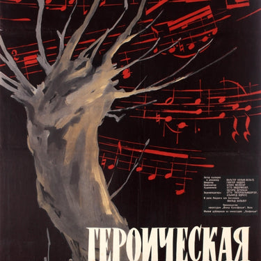 Original vintage Soviet film poster for the first release in the USSR of the Austrian documentary film Eroica Symphony - Героическая Симфония a 1949 Austrian film about the life and work of the notable composer Ludwig van Beethoven (1770-1827). Fantastic design featuring a stylised illustration of a tree trunk in winter with red music sheets and notes flying through the leafless branches against a black background with the text above and below in stylised white letters. Beethoven composed the Symphony No. 3 in E♭ major Opus 55 (Sinfonia Eroica / Heroic Symphony / Beethoven's Eroica) in 1804 and it was first performed in Vienna in 1805. Good condition, folds, creases, minor tear on left margin.