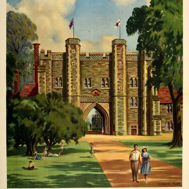 Original vintage British Railways travel poster - Essex See England by Rail - featuring a great image of St. Osyth's Priory depicting a lady and man walking along a path towards the viewer with people relaxing and children playing on the grass under trees in front of the historic Priory gates, the St George Cross and Union Jack flags flying on the towers above the entrance against a blue summer sky and the title text below. Named after an English saint Osgyth (Osyth; d 700), St Osyth's Abbey (St Osyth's Priory) was founded in c 1121, built on the site of the former nunnery and dissolved in 1539 by King Henry VIII; the estate now comprises 22 listed buildings and a registered registered park and garden. Artwork by R Sharps. Published by The Railway Executive (Eastern Region). Printed by Stafford and Co. Ltd. Good condition, restored folds, restored tears, staining, backed on linen.