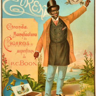 Original antique advertising poster for Eureka superfine Cigars manufactured by P.C. Boon Havana Exportation - Granda Manufactura de Cigaros superfinos de P.C. Boon Habana Exportation - featuring a smiling man wearing a top hat, striped tie, jacket, tan coat and striped trousers, holding up the cigar he's smoking and pointing to a box of cigars on the ground that shows the same image on the inside lid, blowing out the smoke to form the word Eureka, the decorative lettering on side with flowers and view of a ship in the harbour in the background. Fair condition, repaired tears, large restored paper loss in bottom right corner, minor staining, backed on linen.