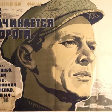 Original vintage Soviet film poster - Все начинается с дороги / Everything Begins with Hitting the Road - about an enthusiastic couple building a road in Siberia to comply with the communist plan, directed by Nikolay Dostal and Villen Azarov and starring V. Avdyushko, L. Khityayeva, S. Gurzo, A. Demyanenko and T. Syomina, featuring an image of the main character in a cap looking into the distance with trucks behind him, the title and rest of the text on the side. Horizontal. Good condition, folds, creasing, tears, staining.