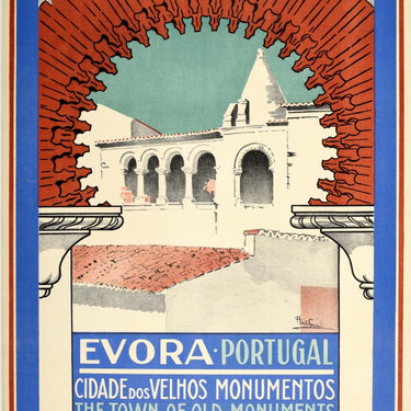 Original vintage travel advertising poster in Portuguese, English and Spanish for the ancient city of Evora Portugal The Town of Old Monuments To Seville through Portugal published by the Company of the Portuguese Railways / Companhia dos caminhos de ferro Portugueses. Great design by Alberto Souza (1880-1961) depicting a view of historical buildings in Evora with the architectural detail of an archway in the foreground, the text above and below in stylised white and grey letters. Printed in Portugal. Good condition, restored tears in margin, staining, backed on linen.