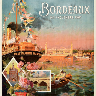 Original antique poster advertising the International Maritime Exhibition Bordeaux 1907 / Exposition Maritime Internationale Bordeaux 1907 featuring a great image by Antoine Ponchin (1872-1933) depicting a sailor rowing a fashionably dressed lady in front of a steamship flying colourful flags with other steam and sailing boats on the reflective water in the harbour and the Grand Palais in the background, smaller images of a bridge and the city's coat of arms decorated with flowers in the foreground and the stylised title lettering against the pale blue sky above. 14 countries took part in the first Exposition Maritime Internationale exhibition from May to November 1907, organised by the Ligue Maritime Francais / French Maritime League (name shown on the ship). Good condition, restored folds, restored paper losses, restored tears, ink stamp at top, backed on linen.