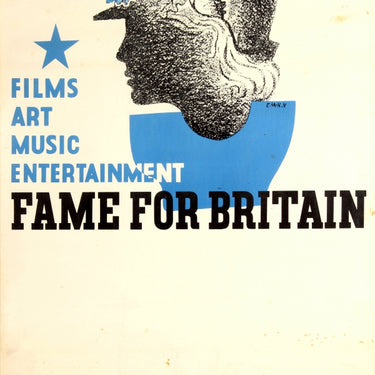 Original vintage advertising poster entitled Films Art Music Entertainment Fame for Britain featuring a great design by one of the most renowned poster artists of the 20th century Edward McKnight Kauffer (1890-1954) showing the profile of a young lady wearing a Britannia style helmet and crown made of oak tree leaves with a star and the text on the left and below in blue and black letters. Made and printed in Great Britain by Lund Humphries, London and Bradford. Good condition, staining and foxing, pinholes in corners, creases in margins.