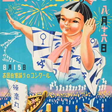 Original vintage travel poster advertising the Floating Lanterns festival and national dance contest in 宮津 Miyazu Kyoto on 15 August featuring a colourful image of a smiling young girl with a polka dot bow in her hair above silhouettes of people dancing in white and boats with flowers in one sailing by lanterns on the reflective water, an outline of the 天橋立 Amanohashidate sandbar (known as the Bridge to Heaven and located in the national park) and mountains on the side with fireworks below the title text along the top. Good condition, restored folds, restored tears, small restored paper losses, minor staining, backed on linen.