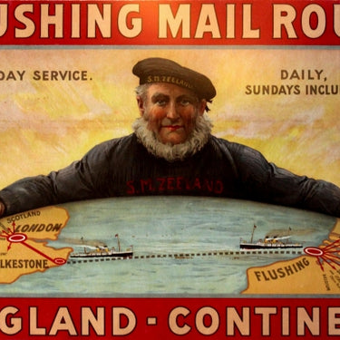 Original antique travel advertising poster for the Flushing Mail Route day service daily, Sundays included, England Continent featuring a great image of a bearded sailor wearing an S.M. Zeeland jumper and cap, his arms stretched over a map marking the ferry routes from London and Folkestone in England with two steamships sailing across the Channel to/from Flushing in the Netherlands with arrows marking destinations further into the UK and Europe: Scotland, Italy, Switzerland, Germany etc. The Stoomvaart Maatschappij Zeeland (SMZ; Zeeland Steamship Company) provided ferry services from 1875 until 1989 when it was bought by Stena Line. Horizontal. Good condition, staining, restored folds, backed on linen.