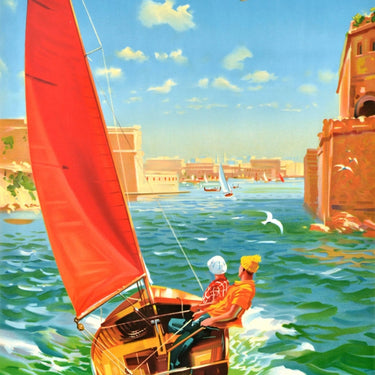 Original vintage travel poster - Fly BEA to Malta GC British European Airways - featuring a great design by Laurence Cyril Bagley (1922-1983) depicting people in a sailing boat in the historical Port of Valletta Grand Harbour with more boats at sea and buildings along the water below a plane flying across the sky. The island of Malta is located in the Mediterranean Sea and is a popular tourist destination; it was a British colony from 1813-1964, since 1974 the Republic of Malta. British European Airways BEA was a British airline operating services within the UK and to Europe, North Africa and the Middle East from 1946 to 1974 when it merged with BOAC to form British Airways. Printed in Great Britain by Waterlow and Sons Limited London and Dunstable. Very good condition, creasing, small tears.