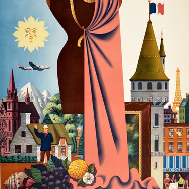Original vintage travel poster - Fly TWA to France - issued by Trans World Airlines featuring a colourful design by Simon Greco (1917-2005) depicting a smiling sun above a plane flying over a snow topped mountain representing the French Alps for skiing and winter sports with images of historical and notable buildings including the Eiffel Tower in Paris and people sitting outside a restaurant with the artist's name as Cafe S. Greco on the awning and a man waving to the viewer from a window above, part of a framed painting representing art visible behind a dressmaker's mannequin draped in fabric representing the fashion industry and a French flag flying below the stylised title text above showing the TWA lettering flying at speed and rest of the text below a cluster of wine grapes with a seashell and flowers. Very good condition, minor browning on edges.