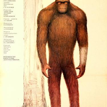 Original vintage Soviet film poster for a documentary movie about the origin of man and the potential existence of an Abominable Snowman (or Yeti) - По следам снежного человека / On the Trail of Bigfoot - featuring a great illustration of a large ape man-like figure standing in front of a tree with the stylised text above and below. Very good condition, folded as issued, staining in margins and minor tear in bottom margin.