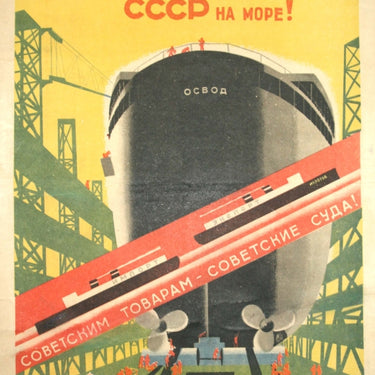 [ON RESERVE PENDING PAYMENT] Original vintage Russian poster - For the Strength of the Soviet Merchant Navy - promoting a lottery for the economic independence of the USSR at sea, Soviet Production - Soviet Ships! Buy your OSVOD lottery tickets! Image of workers building a ship (OSVOD) in the docks with text above and below and two ships (Import and Export) running across the centre. The OSVOD Red Cross Society is the oldest organisation in Russia, formed in 1871, to promote water transport and protection of human life on the waterways.