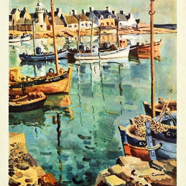 Original vintage railway travel poster for France Brittany issued by the state owned French national railways (SNCF Societe Nationale des Chemins de Fer Francais; founded 1938) featuring a colourful painting depicting a view of fishing boats moored in a harbour with a lighthouse and buildings along the beach in the background. Artwork by Edmond Ceria (1884-1955). Printed by Draeger Paris France. Good condition, tears, creasing, staining.
