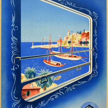 Original vintage travel poster - Ce Soir Dans Le Train... Demain Matin Cote D'Azur / Tonight On The Train... Tomorrow Morning French Riviera - featuring colourful artwork by Roland Hugon (b.1911) of a harbour scene viewed from a framed train window with the text above and with the Societe Nationale des Chemins de Fer SNCF logo below on a blue background. Printed in France for and by French National Railways. Good condition, restored paper losses on edges, restored tears, minor staining, backed on linen.