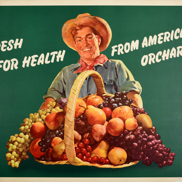 Original vintage food poster - Fresh For Health From America's Orchards - featuring a great design depicting a smiling farmer wearing a hat and red neckerchief with his shirt sleeves rolled up, showing a basket of fresh fruit to the viewer, full of red and green grapes, apples, pears, cherries, peaches and plums with the bold white lettering on a green background. Printed by Schmidt Litho Co San Francisco. Horizontal. Large size. Good condition, restored paper losses, restored tears, staining, backed on linen.