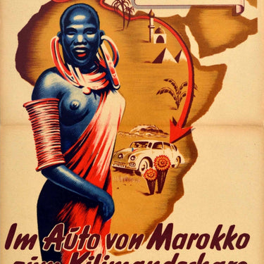Original vintage movie poster for a Czechoslovak documentary film by J. Hanzelka and M. Zikmund - Im Auto von Marokko zum Kilimandscharo / From Morocco to Kilimanjaro in a Car - featuring a Maasai tribe lady with a shaved head and earrings on her stretched earlobes with jewellery around her neck and on her arm, dressed in traditional red Shuka cloth wrapped around her body, in front of a brown and yellow shaded map of Africa with an arrow marking the route from Morocco along the North and East borders of the continent decorated with palm trees and a cactus plant, a mosque and pyramids pointing to a car in front of the Kilimanjaro mountain near Tanzania, the title text in bold letters below. Good condition, fold, repaired tears, browning.
