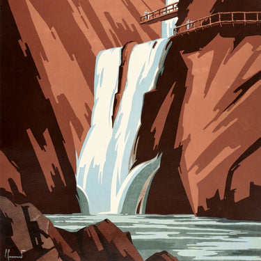 Original vintage PLM Paris Lyon Mediterranee railway travel poster for the Gorges de la Diosaz Vallee de Chamonix Servox featuring a stunning scene of the dramatic narrow valley gorge with water falling down the rocks and tourists walking along and enjoying the view from the suspended footpaths. Artwork by the French painter Pierre Commarmond (1897-1983). Excellent condition, backed on linen.