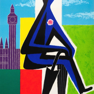 Original vintage travel advertising poster issued by Air France to promote travel to Great Britain / Grande Bretagne. Great mid-century modern design by Guy Georget (1911-1992) featuring a black and blue silhouette of a man wearing a bowler hat and holding an umbrella with a flower in his suit lapel and pin stripes visible on his trouser leg, sitting against a colourful background in front of Big Ben and the Houses of Parliament, the text in red above and in yellow below. Very good condition, minor restoration to folds and small tears, backed on linen.