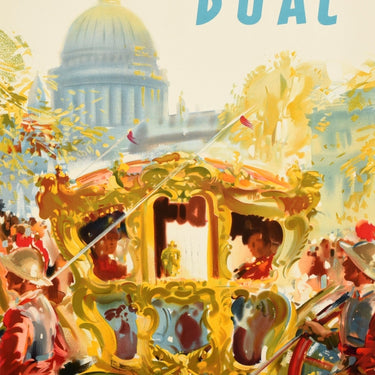 Original vintage travel poster - Fly to Great Britain by BOAC - featuring the procession of the annual Lord Mayor's Show depicting the Lord Mayor of London's State Coach riding past St Paul's Cathedral in the City of London accompanied by the Company of Pikemen and Musketeers in their ceremonial uniform with the title text in blue lettering and a plane flying in the sky above. Artwork by the notable British painter and illustrator Frank Wootton (1911-1998). The Lord Mayor's gold carriage is kept at the Museum of London and occasionally displayed when not in use; the Lord Mayor's Show has been held since the 16th century. The British Overseas Airways Corporation BOAC was the British state airline created in 1940-1946 as the result of a merger, merging again in 1971-1974 to create British Airways BA. Good condition, restored tears, restored paper losses, backed on linen.