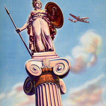 Original vintage travel poster - Fly TWA Greece Trans World Airlines - features a statue of the ancient Greek goddess Athena holding a shield and spear on top of a decorative column (one of two statues in the Academy of Athens as the city's patron) with a Lockheed Constellation plane flying in the sky in the background, the bold stylised title text above and below. Good condition, restored tears, restored punched holes, restored paper losses, staining, backed on linen.