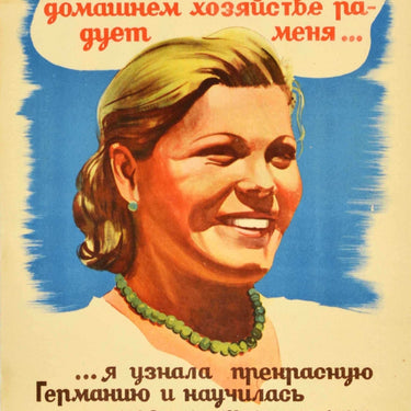 Original vintage World War Two anti-Soviet German Nazi political propaganda poster depicting a smiling lady against a blue background with the text in Russian in red on a white speech bubble and below reading - Working in a German household makes me happy ... I got to know beautiful Germany and learned a lot that will be useful to me later in life / Работа в немецком домашнем хозяйстве радует меня... я узнала прекрасную Германию и научилась многому такому, что впоследствии пригодится мне в жизни. Good condition, light creasing, repaired tears, paper skimming, backed on linen, linen on top and bottom edge.