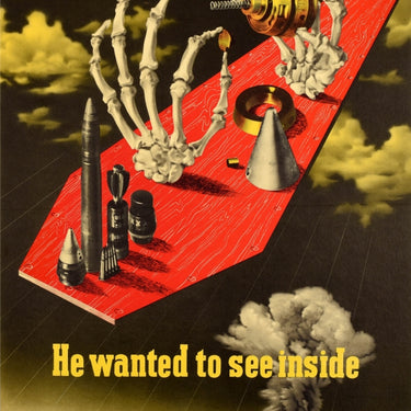 Original vintage World War Two safety poster - He wanted to see inside Accidents occur daily through wilful tampering. Taking ammunition to pieces is illegal, wasteful and dangerous. Ask the expert - featuring a modernist design by the notable British graphic designer Abram Games (Abraham Gamse; 1914-1996) depicting two skeleton hands holding parts of a bomb with missiles and other ammunition devices on top of a coffin in red rising as if to heaven above an explosion on the ground in the distance below, set against a cloudy sky background with the bold stylised lettering in yellow and in black and red below. Printed for H.M. Stationery Office by Alf Cooke Ltd, Leeds and London. Good condition, small restored tears, backed on linen.