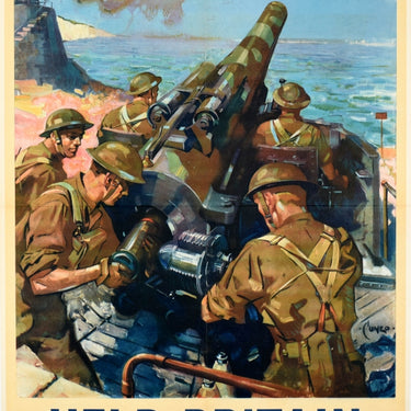 Original vintage World War Two propaganda poster - Help Britain Finish the Job! - featuring dramatic artwork by the notable British artist Terence Tenison Cuneo (1907-1996) showing five soldiers in uniform loading and firing a cannon gun from the shore with another artillery gun firing from a higher gun battery point on the side and white cliffs visible in the distance, the smoke rising above the sea in front of the blue sky and the bold title text in the margin below. Good condition, restored folds, small restored tears, backed on linen.