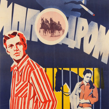 Original vintage Soviet movie poster for a film directed by Radomir Vasilevsky based on the book by Nikolai Leonov - Voluntary Surrender - Ипподром / Hippodrome horse racing course. Fantastic design featuring a close-up image of a man smoking at the top and images of a man wearing a striped shirt and a lady standing in front of a horse box below with a photograph of a horse cart in the O of the title text across the centre, the rest of the text above and below in stylised blue letters. Very good condition, folded as issued, minor holes.