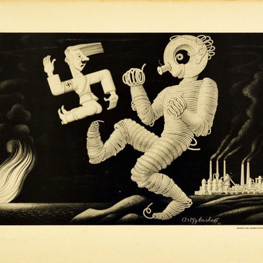Original vintage World War Two propaganda poster featuring a surreal black and white design by the Russian American artist Boris Artzybasheff (1899-1965) depicting a figure made of steel coil wire kicking a surprised looking Adolph Hitler with a swastika shaped body towards a fire with the flames and smoke rising into the dark sky, a factory visible in the distance on the other side. Copyright 1943 Wickwire Spencer Steel Company. Horizontal. Good condition, creasing, tears, staining, small paper loss on margins.