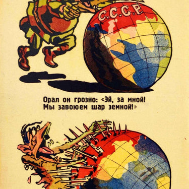 Original vintage Soviet propaganda poster - Survive before thrive / Не до жиру, быть бы живу - featuring a caricature of Adolph Hitler in a green uniform and a Nazi swastika patch on his shoulder reaching clawed hands and sharp teeth trying to bite into a globe of the world with USSR / CCCP marked on the map and the caption reading - He shouted menacingly: "Hey, follow me! We will conquer the globe!" / Орал он грозно: "Эй, за мной! Мы завоюем шар земной!" and an illustration below portraying him being pierced by sharp weapons sticking out from the globe with the caption - Now he screams twice as loud. But he does not threaten, he howls in fear. Poster from the Okno TASS series issued by the Soviet Union Telegraph Agency designed to raise morale during World War Two. Good condition, minor tears on edges, browning, punched holes at the top.