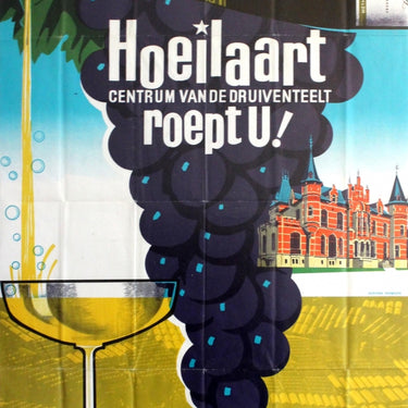 Original vintage drink event advertising poster for the Hoeilaart Grape and Wine Festival 22-25 September 1972 featuring a great image of champagne pouring from a bottle into a glass with bubbles splashing up in front of a bunch of grapes and the Hoeilaart Town Hall. Colourful design by the Belgian artist, Herman Verbaere (1906-1993). Good condition, folds, pinholes.