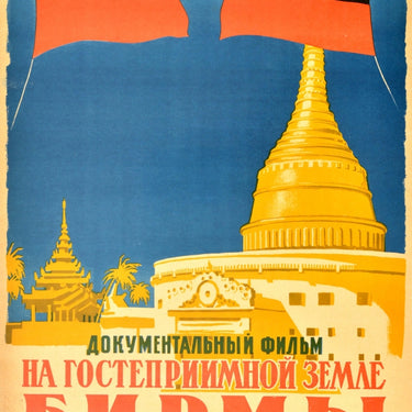 Original vintage documentary film poster for In The Hospitable Land of Burma / Документальный фильм на гостеприимной земле бирмы featuring a great image of historic temple buildings and palm trees below a blue sky with the flags of the Soviet Union and Burma (now Myanmar) flying above, the bold stylised title lettering and credit text below. Documentary on the state visit to Burma by the Soviet politician Nikolai Bulganin with the leader of the Soviet Union Nikita Krushchev in 1955. Good condition, minor stain marks at bottom.