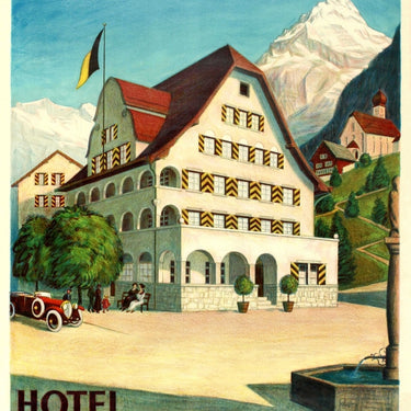 Original vintage travel advertising poster for the Hotel Kurhaus in Wassen in the canton of Uri in Switzerland where the Gotthard Railway (opened 1882) forms a double loop near the Gotthard Tunnel / Hotel Kurhaus Wassen an der Gotthatdlinie. Stunning image of the hotel with a small fountain in the foreground, a family walking to the hotel passing people resting in the shade as a smartly dressed driver waits by a red classic car near trees, the view behind the hotel leading up a zigzag path on a grassy hill to the renowned Wassen Chapel viewed as a landmark on the train journey with the snowy mountain peaks of the Alps in the background, the text below. Printed in Switzerland by Gebr. Fretz A.G., Zurich. Very good condition, pinholes, minor creases and tears in margins.