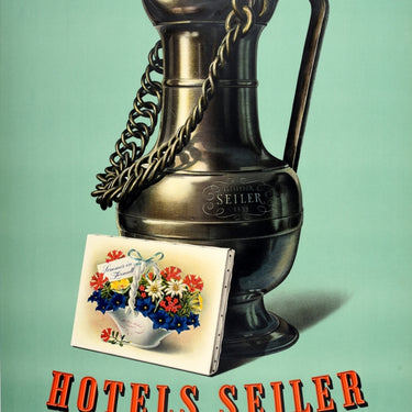 Original vintage poster advertising Hotels Seiler Zermatt featuring a great illustration by Edi Hauri (1911-1988) of a canvas painting of a basket of alpine flowers with a tag on a ribbon reading Sommer In Zermatt / Summer In Zermatt leaning against a traditional metal wine jug with the bold stylised lettering below. Founded in 1855, the Seiler Hotels of Mont Cervin Palace and Hotel Monte Rosa have provided accommodation for visitors to the village and formed an important part of Zermatt's tourism history. Zermatt is located in the Valais region in southern Switzerland and is a popular mountain resort for hiking and climbing in the summer and for skiing and other winter sports. Large size. Good condition, small restored tears on edges, minor staining, backed on linen.