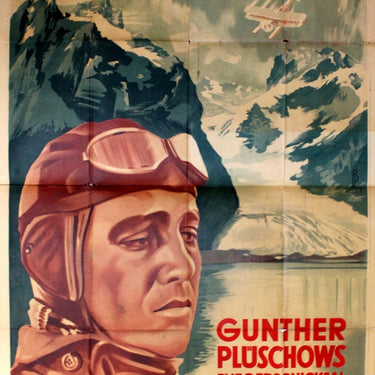 Original vintage documentary film poster for a German movie, Ikarus: Gunther Pluschows Fliegerschicksal. Filmhaus Karl Mischka Korlitz 1. Image of a pilot in a helmet with goggles and a bi-plane flying over snowy mountains. A poster for the re-release of a 1932 film about Gunther Plüschow, a German aviator, aerial explorer and author from Munich, Bavaria. His feats include the only escape by a German prisoner of war from Britain back to Germany; he was the first man to explore and film Tierra del Fuego and Patagonia from the air. Large size. Fair condition, folds, loss on folds, tears, pinholes.