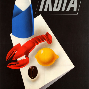 [ON RESERVE 21/5] Original vintage advertising poster for IKOFA the International Colonial Goods and Delicatessen Exhibition held from 25 September to 5 October 1958 in Munich Germany. Stylised mid-century modern design depicting a table laid with food - a coffee bean, lemon and lobster - with a napkin on a white cloth against a black background with the text above and below. Printed in Germany by Carl Gerber, Munich. Very good condition, folds, faint creases on margins.