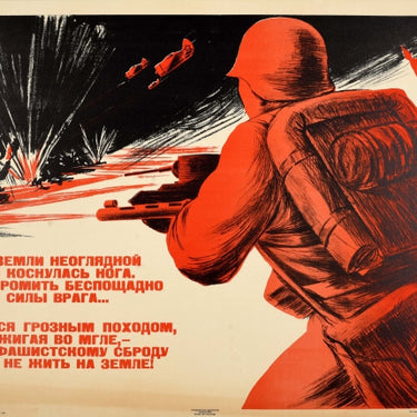 Original vintage Soviet World War Two propaganda poster - Our land has been touched by the infinite enemy We will smash the enemy's dark forces mercilessly ... Let's move on a terrible campaign, lighting a light in the darkness, so that the fascist robbery will no longer live on earth! / Нашей земли неоглядной вражья коснулась нога. Будем громить беспощадно темные силы врага ... Двинемся грозным походом, свет зажигая во мгле, чтобы фашистскому сброду больше не жить на земле! Dynamic design featuring Red Army soldiers charging forward alongside a tank firing their guns towards an explosive battlefield with military planes overhead and a red flag reading - For the family! For honour! For freedom! / Для родину! За честь! Для свободу! - the rest of the text on the side below. Horizontal. Good condition, restored paper losses, restored tears, minor creasing, minor staining, backed on linen.