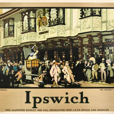 Original vintage LNER train travel poster for Ipswich featuring stunning artwork by the notable painter and poster artist Fred Taylor (1875-1963) titled Mr. Pickwick The Ancient House depicting a scene from the 1836-7 novel The Pickwick Papers by the English author Charles Dickens (1812-1870) of Mr Pickwick being carried through the Suffolk town on a sedan chair past the historical 15th century Ancient House with Venetian style Ipswich Windows and its Tudor panels representing America Africa Asia Europe and Royal Coat of Arms located on the corner of Butter Market and St Stephens Lane. Originally written as a periodical serial published in 19 issues, the fictional Pickwick Papers is based on the travels and adventures around England by the Pickwick Club led by the kind elderly gentleman Samuel Pickwick, the founder and president of the club. Horizontal. Published by The London & North Eastern Railway. Printed by The Dangerfield Printing, London. Horizontal. Large size. Good condition, restored folds, restored tears, restored pinholes, small restored paper losses in margins, staining, backed on old linen.